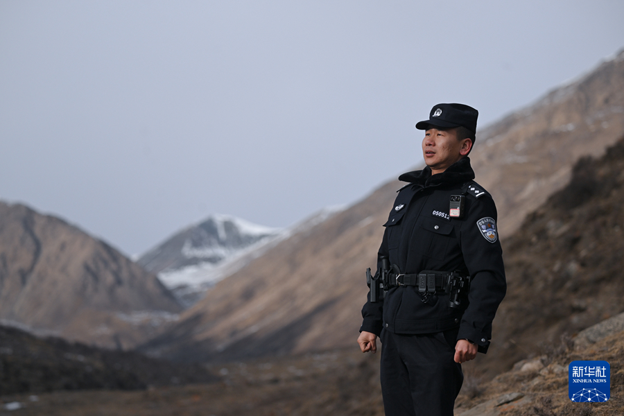 1月8日,在青海省海北藏族自治州门源回族自治县境内的老虎沟,民警李永成在祁连山巡护。新华社记者 张龙 摄