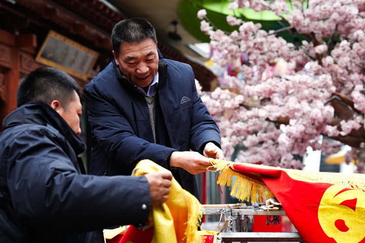 1月25日,在青海省西宁市城北区,周邦辉(右)与徒弟刘成玉搭建皮影戏台。